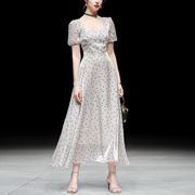 Chavin Koko新款女装法式波点长裙气质收腰短袖显瘦中长款连衣裙
