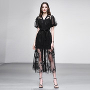 Chavin Koko夏装款气质V领仙女范收腰大摆立体网纱绣花两穿洋装