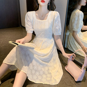 sandro bassa法式方领连衣裙女夏2022新款小个子收腰绣花中长裙子