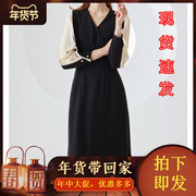 现货2019秋新拼色灯笼长袖收腰中长款开叉连衣裙恩裳 9C59305700