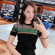 雅艺欧时力新季2019新款秋短袖透视纱拼接套头针织衫女1ZY3031840
