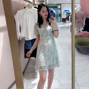 唐唐加2020新款夏短袖蕾丝连衣裙女高腰V领泡泡袖裙子2RN1085480