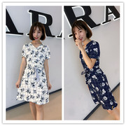 PRICH20年夏韩版圆领条纹连衣裙女修身气质系带中长裙 PROWA2607M