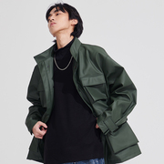 Nought Group秋冬新款墨绿色多口袋可收腰男女质感PU皮衣夹克风衣