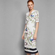ted baker2021夏季新款V领水墨画印花弹力收腰修身包臀连衣裙旗袍