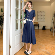 谷七七GUQIQI复古泡泡袖牛仔长裙收腰洋装女2023年新款夏高级感