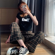 Brandy Melville春夏同款粉色格子松紧腰直筒裤bm高腰休闲长裤女
