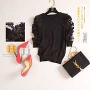 海尚集锦 春装新品2016女装 唯美立体花朵圆领五分袖针织毛衣B986