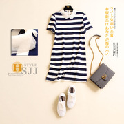 海尚集锦 春装新品2016女装 欧根纱翻领 条纹显瘦连衣裙B1927