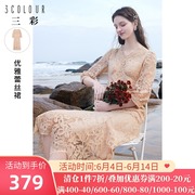 三彩2021年春季新款V领高腰中长款蕾丝裙甜美设计感小众连衣裙女