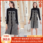 三彩2019冬季半高领格纹拼接毛边小香风收腰长袖连衣裙D942840L00