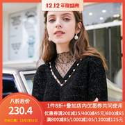 三彩2019初秋冬季新款网纱立领连衣裙长袖冷淡打底黑色针织裙子女