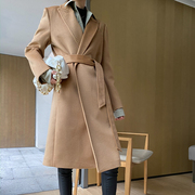 2020秋冬高端水波纹羊毛大衣系带西装领修身长中款双面羊绒呢外套