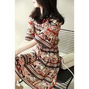 Alice Vivian春夏民族风真丝印花裙子修身显瘦复古气质短袖裙子女