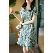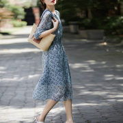Alice Vivian雅致朦胧美乔其桑蚕丝碎花连衣裙圆领七分袖裙子女夏