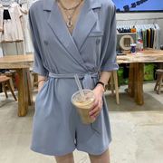 viki韩版连体裤女2020气质西装领宽松休闲系带收腰阔腿连衣短裤女