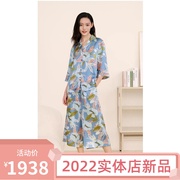 万事利真丝丝绸睡衣套装女2022实体店新款蓝色印花雾里繁花礼盒装