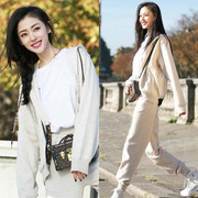 潮牌2020秋冬新款张天爱同款休闲两件套女米白色时尚宽松卫衣套装
