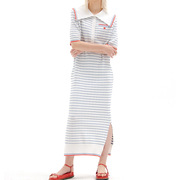 EENK21ss学院风翻领条纹连衣裙女夏韩国设计小众polo开叉过膝长裙