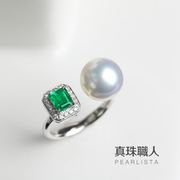 「祖母绿开口戒」南洋白澳白海水珍珠18K白金天然钻石活口戒指