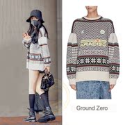 韩国代购GROUND ZERO 杨幂同款小菱格拼色套头字母数字印花针织衫