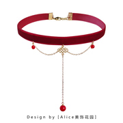 Alice原创设计酒红色丝绒复古气质choker项圈女颈带中国风锁骨链