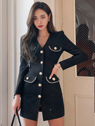 sandro asw小香风长袖连衣裙女2021秋新款法式名媛V领显瘦小黑裙