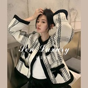 sandro asw小香风粗花呢外套女2022新款法式复古撞色圆领格子上衣