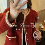 sandro asw红色羊羔毛绒外套女2022秋冬新年结婚加厚皮毛一体上衣