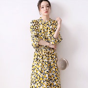 日系2019夏季新款女装精品衬肤显白黄色系印花松紧收腰丝棉连衣裙