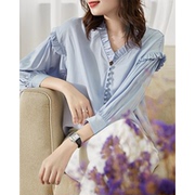 OLYFOU 解锁新搭配V领木耳单排包扣荷叶边灯笼袖纯色衬衫女2021春