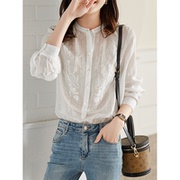 OLYFOU 2021春夏新款上衣朦胧镂空刺绣立领+半门襟百搭苎麻衬衫女