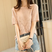 OLYFOU 蕾丝短袖钩花镂空针织罩衫轻薄宽松小性感透视藕粉色上衣