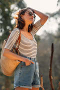法国代购弹力罗纹针织短袖T恤式 bodysuit 条纹印花露背连体衣