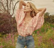 DOEN 美国代购 JEANNE 粉色格子印花宽松版型泡泡袖上衣 衬衫