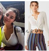 Selena Gomez街拍款代购性感V领包身针织衫 百搭凸显曲线长袖上衣